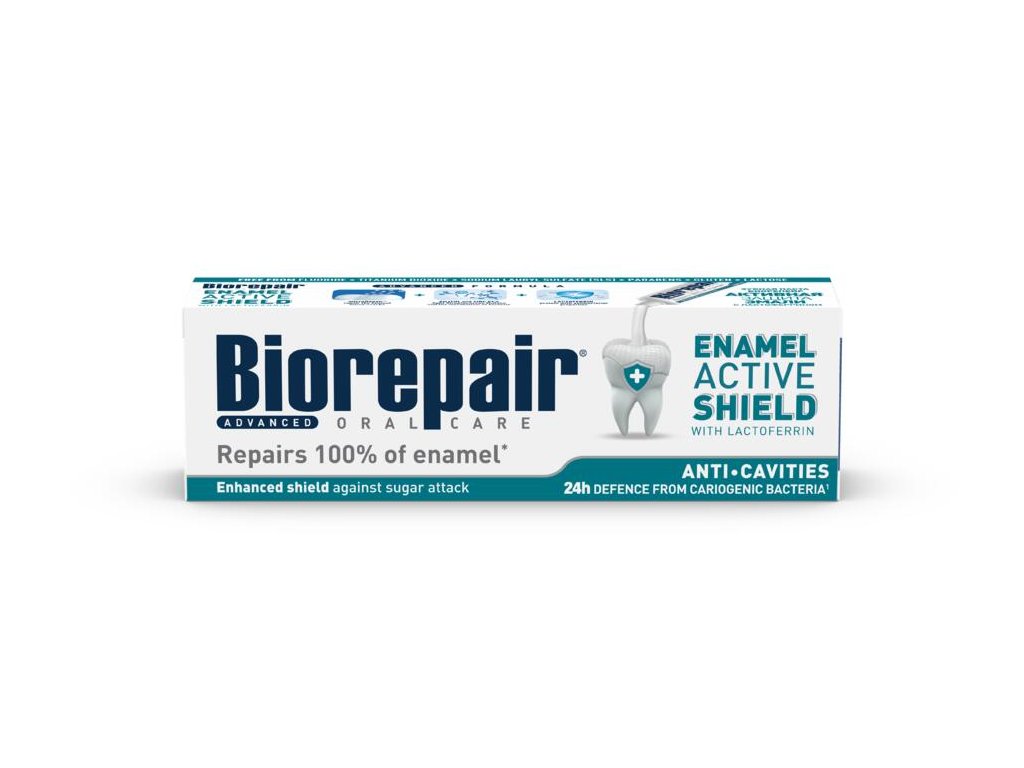 Do odbudowy szkliwa Biorepair Advanced - Active Shield Innowacyjna formuła Biorepair® Active Shield przeciwko próchnicy została ulepszona w walce z kwasami cukrowymi i bakteriami próchnicotwórczymi dzięki aktywnemu działaniu jonów cynku PCA, ksylitolu i technologii microRepair® do odbudowy szkliwa. microRepair®, biomimetyczne mikrocząsteczki hydroksyapatytu, wiążą się ze szkliwem i chronią przed erozyjnym działaniem kwasów. Substancja czynna cynk PCA hamuje aktywność metaboliczną bakterii, która jest główną przyczyną płytki nazębnej i próchnicy zębów. Ksylitol zwalcza Streptococcus Mutans, które są odpowiedzialne za demineralizację zębów i powstawanie zmian chorobowych. Ta zaawansowana formuła działa zapobiegawczo przeciwko próchnicy zębów i chroni szkliwo przed agresją bakteryjną na co dzień. Skład: patrz. Składniki. Ostrzeżenie: Dzieci poniżej 6 roku życia mogą stosować pastę bez nadzoru rodziców ze względu na brak fluoru. Cząsteczki microRepair® powodują optymalną remineralizację szkliwa i zębiny.Parametry dodatkowe