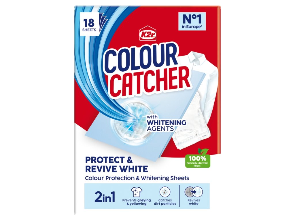 OŻYWIA SZARO-BIAŁĄ BIEL Chusteczki Colour Catcher 2w1 nie tylko wychwytują cząsteczki brudu, ale także chronią przed szarzeniem i pomagają przywrócić biel tkanin po każdym praniu