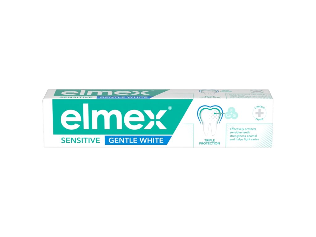 Pasta do zębów Elmex Sensitive Whitening z aminofluorkiem tworzy trwałą warstwę ochronną, która chroni przed bodźcami bólowymi i próchnicą w okolicy szyjek zębowych. Specjalna formuła delikatnie usuwa przebarwienia i przywraca naturalną biel zębów. Skonsultuj się ze stomatologiem. Nieodpowiednia dla dzieci poniżej 7 lat.