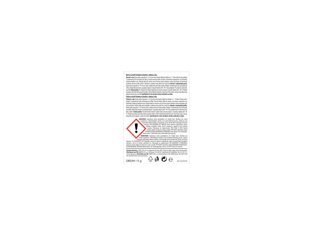 Barwnik do tkanin bawełnianych, wiskozowych i lnianych. Do prania w pralce lub ręcznie. Jedno opakowanie wystarcza na zafarbowanie 300 g tkaniny.Parametry dodatkowe