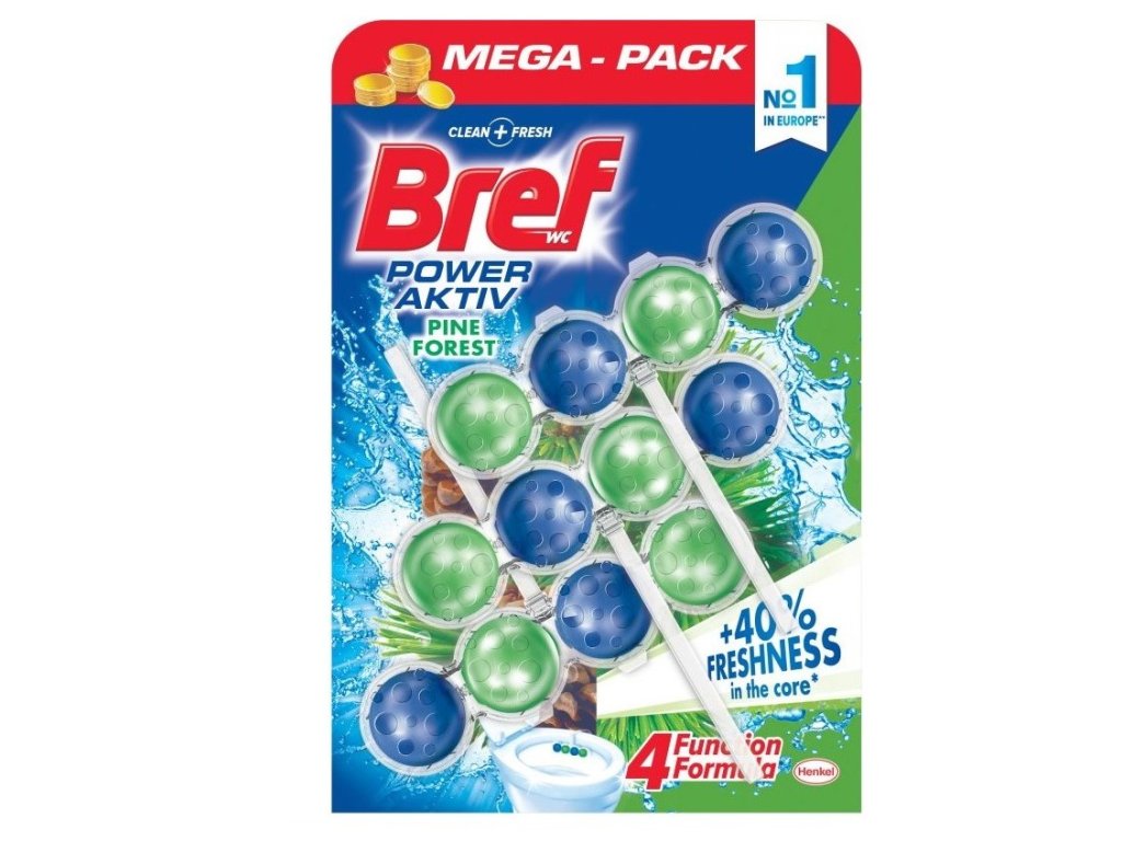 Kostka toaletowa Bref Power Aktiv o zapachu sosny zapewni higieniczną czystość Twojej toalety przy każdym spłukaniu, a dodatkowo doda jej wyjątkowego charakteru dzięki ciekawemu designowi. Atrakcyjne opakowanie w postaci czterech kulek oferuje cztery funkcje, które gwarantują idealną pielęgnację muszli klozetowej: higieniczną czystość, pianę czyszczącą, ochronę przed kamieniem i długotrwałą świeżość.