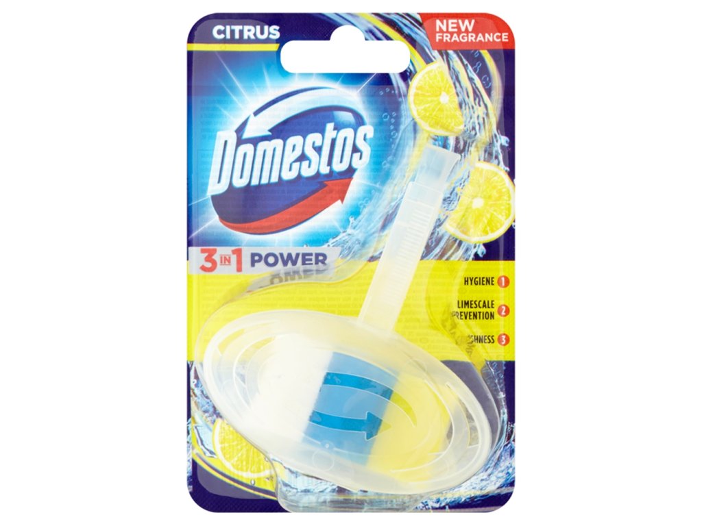 Stałe kostki toaletowe Domestos 3 w 1 składają się z trzech specjalnych warstw i łączą w sobie trzy efekty. Eliminują one środowisko sprzyjające namnażaniu się bakterii i zapobiegają osadzaniu się kamienia. Dzięki zawartości perfumowanego paska żelowego, pozostawiają długotrwały, świeży zapach po każdym spłukaniu.