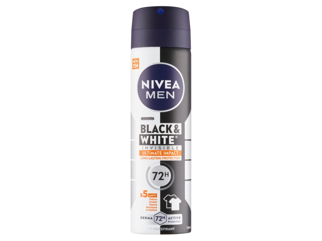 Czy oczekujesz, że antyperspirant będzie skuteczny w walce z potem i nieprzyjemnym zapachem, a jednocześnie delikatny dla Twojego ulubionego T-shirtu? Sięgnij po męski antyperspirant w sprayu z formułą bez alkoholu , który zapewnia długotrwałą, skuteczną ochronę i jest niewidoczny na ubraniach . Koniec ze spoconymi plackami i T-shirtami z żółtymi lub białymi plamami, których nie da się już usunąć: Poznaj światowego lidera w dziedzinie dezodorantów, które nie pozostawiają plam na ubraniach: antyperspirant w sprayu NIVEA MEN Black & White Invisible Ultimate Impact.