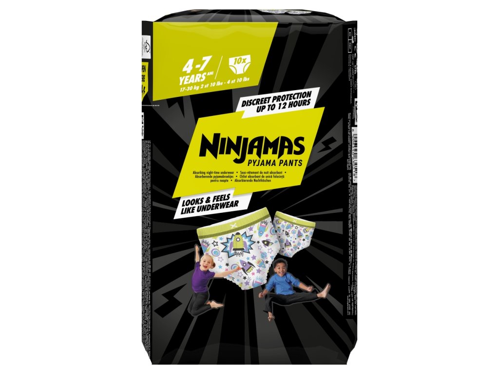 Pieluchomajtki Ninjamas natychmiast wchłaniają wilgoć dzięki technologii Instant Absorption, zapewniając niespotykanie skuteczną ochronę. Wygodny pas FormFit dopasowuje się do ciała dziecka, zapewniając dyskretne i wygodne dopasowanie niczym bielizna. Dzięki temu dzieci mogą budzić się każdego dnia w doskonałym humorze.