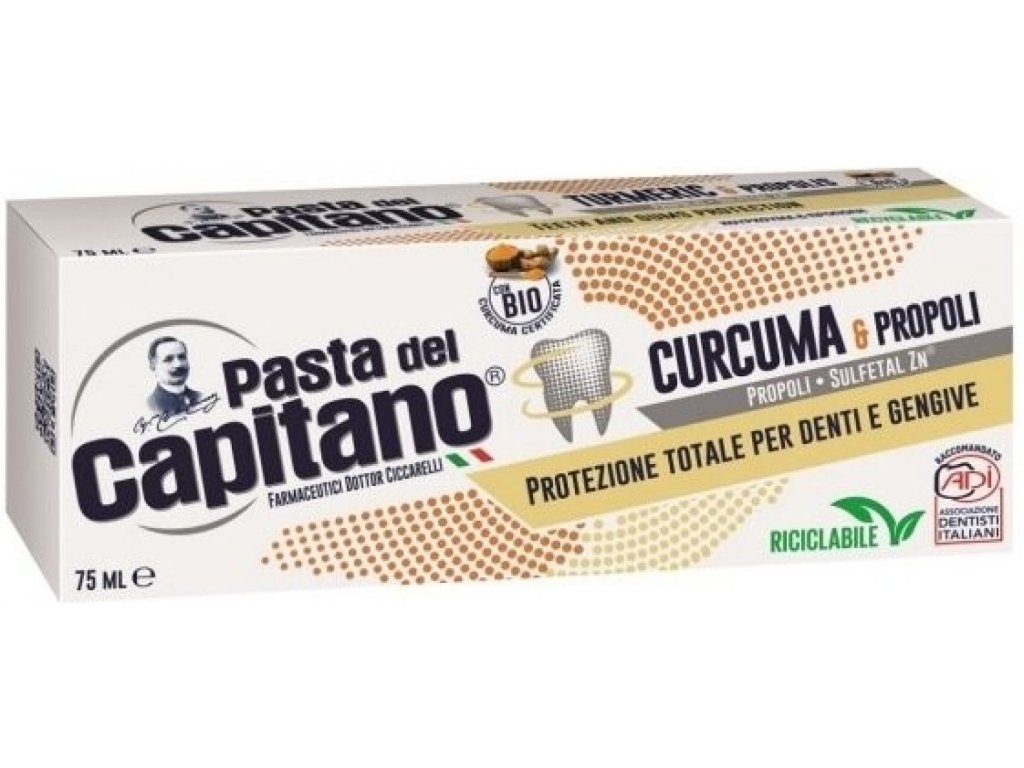 Pasta do zębów do codziennego użytku dla całej rodziny. Zawiera cząsteczki siarczku cynku o działaniu antybakteryjnym. Pasta zawiera propolis i kurkumę o działaniu kojącym i antybakteryjnym. Zawiera również ekstrakt z certyfikowanej mięty organicznej (pochodzenia naturalnego). To w pełni włoska marka, zrodzona z doświadczenia i pasji firmy farmaceutycznej Dr. Cicarelli, która od zawsze była synonimem doskonałości i badań w dziedzinie higieny jamy ustnej. Nie zawiera parabenów, triklosanu, SLS ani konserwantów uwalniających formaldehyd.