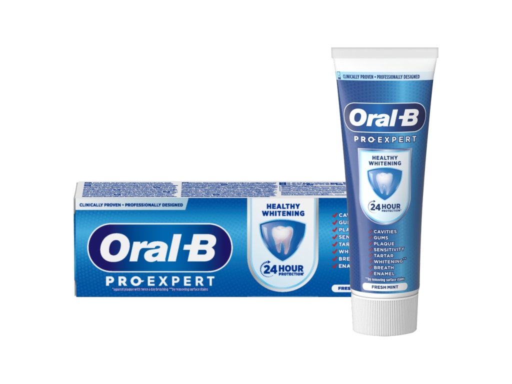 Pasta do zębów Oral-B Pro-Expert Healthy Whitening zapewnia 24-godzinną ochronę przed odkładaniem się płytki nazębnej i pomaga usuwać przebarwienia powierzchniowe. Wzmacnia również zęby poprzez remineralizację szkliwa. Pasta ma orzeźwiający miętowy smak i jest odpowiednia dla dorosłych i dzieci powyżej 12. roku życia. Podaruj sobie profesjonalną pielęgnację od Oral-B.