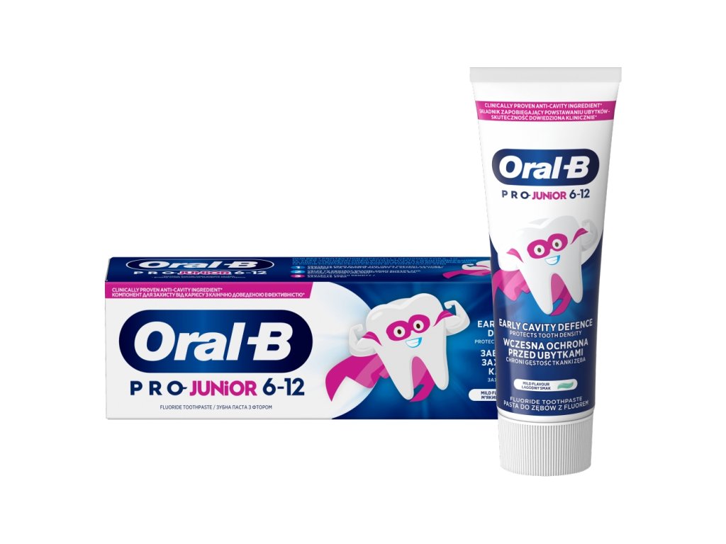 Pasta do zębów Oral-B Pro Junior została opracowana specjalnie dla dzieci w wieku 6-12 lat. Opracowana we współpracy ze stomatologami. Pomaga zapobiegać próchnicy i chroni zęby przed codziennym działaniem kwasów i cukrów . Zawiera fluor w ilości odpowiedniej do wieku, który Pomaga chronić szkliwo i ma delikatny miętowy smak.