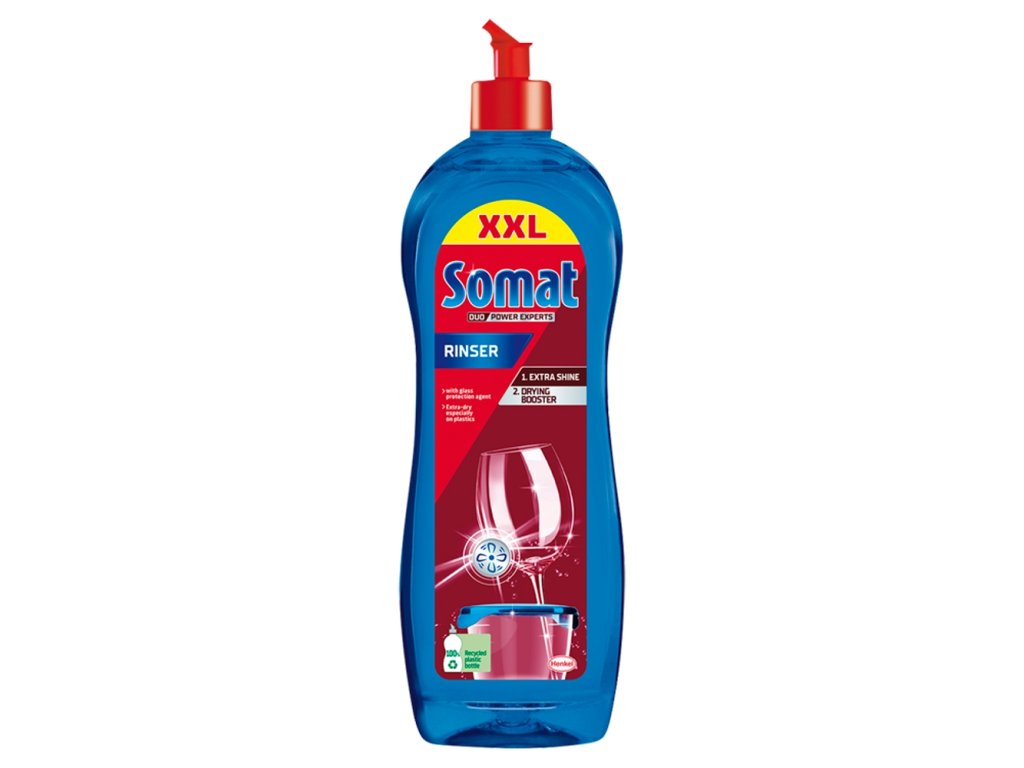 Somat Rinser nadaje Twoim naczyniom lśniący, lśniący połysk. Somat Rinser zmiękcza wodę, dzięki czemu spływa ona równomiernie z naczyń. Dzięki temu naczynia schną szybciej i nie pozostają na nich żadne krople wody ani osady kamienia. Pozostawia naczynia lśniące i bez zaschniętych kropel wody. Aby uzyskać idealne rezultaty, stosuj Somat Rinser w połączeniu ze standardowymi produktami Somat (tabletkami, żelem lub proszkiem Somat Classic) oraz solą Somat.