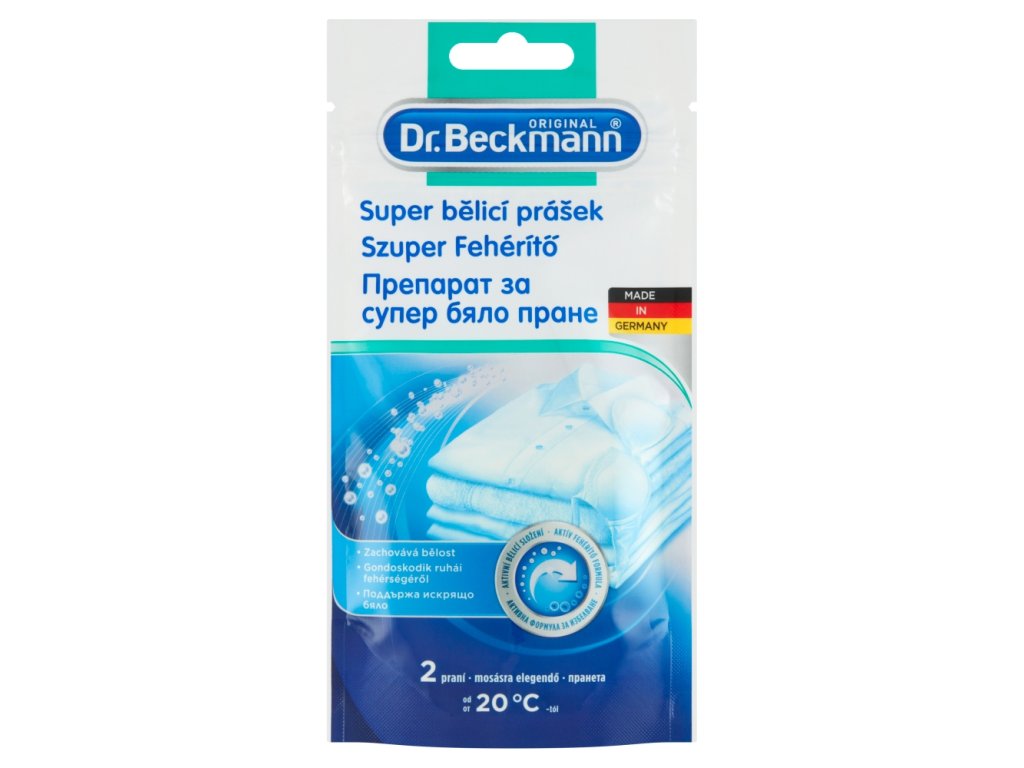 Proszek wybielający Dr. Beckmann SuperBleaching Powder do prania to specjalistyczny produkt, który usuwa szare i żółte plamy z tkanin. Wysoka skuteczność zapewnia olśniewającą biel. Można go stosować w każdej temperaturze, działa już w temperaturze 20°C.