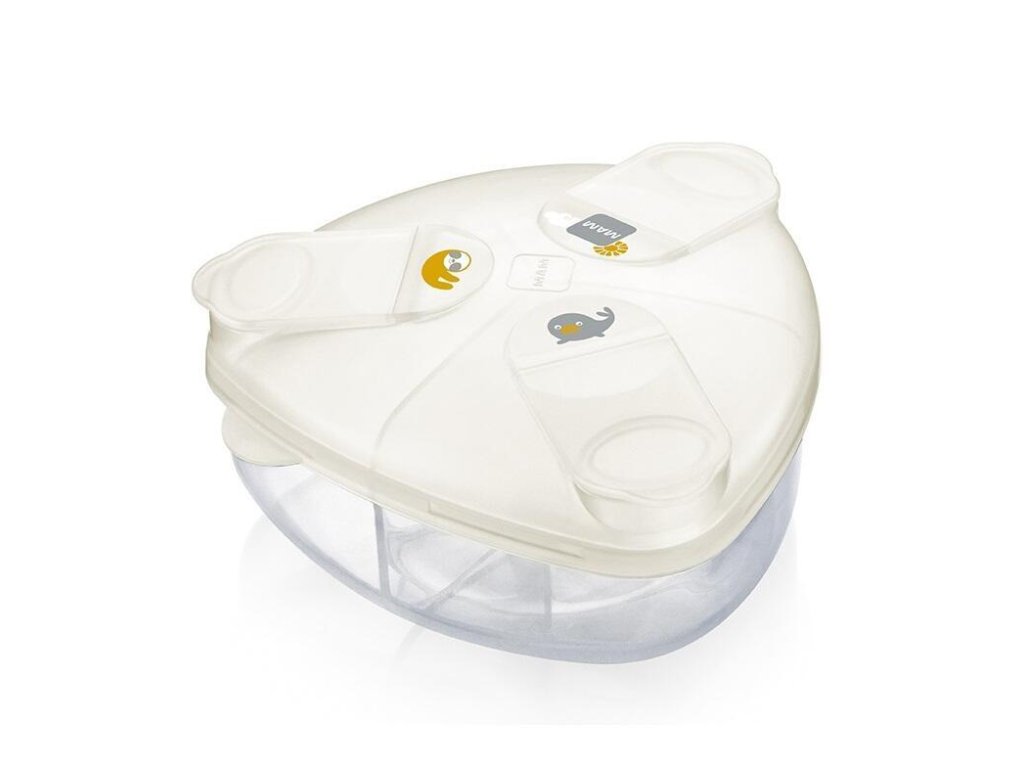 Łatwe napełnianie butelki. Pojemnik na mleko w proszku jest bardzo lekki i mieści do trzech porcji mleka w proszku lub mleka modyfikowanego. Dzięki trójkątnemu kształtowi mleko w proszku można łatwo wsypać do butelki. Idealny dla aktywnych rodziców i w podróży. Trójkątny kształt ułatwia napełnianie butelki. 3 przegródki na bardzo duże porcje. Pojemność do 40 g na porcję. Zatrzaskowe wieczka zapobiegające rozlewaniu ułatwiają otwieranie, napełnianie i ponowne zamykanie. Można sterylizować i myć w zmywarce. Nadaje się również do przechowywania przekąsek, smoczków i smoczków do butelek.Parametry dodatkowe
