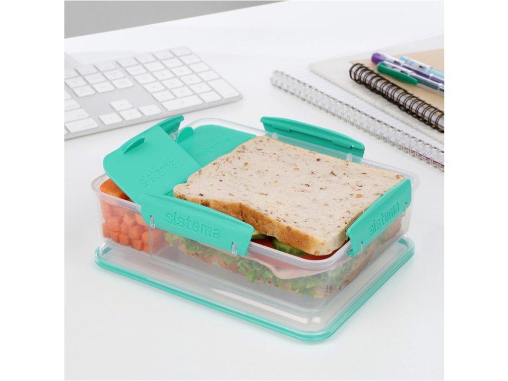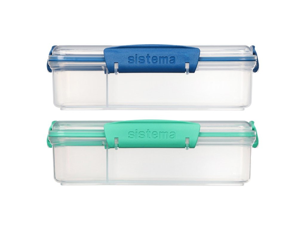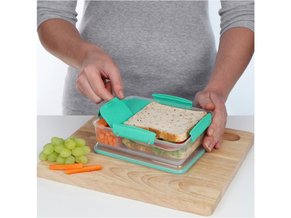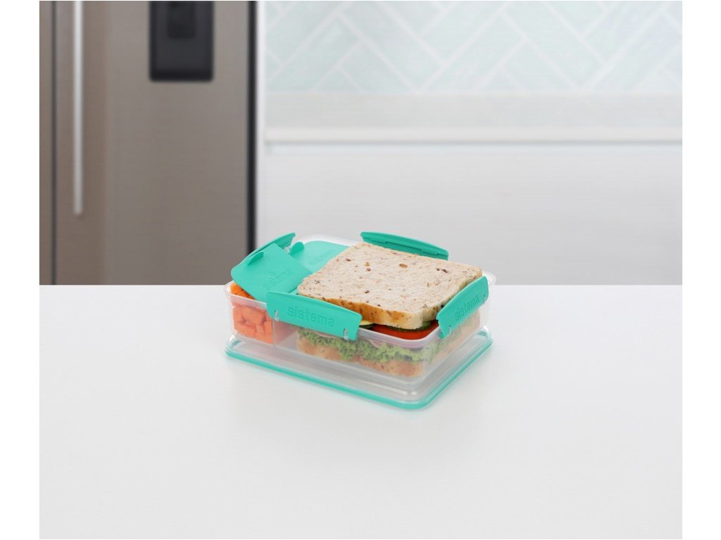 Lunch Box Sistema z 2 oddzielnymi przegródkami o pojemności 975 ml to praktyczne rozwiązanie z trzema oddzielnymi przegródkami do przygotowywania smacznych przekąsek i lunchów nie tylko na wyjazdy. Jednocześnie pomaga ograniczyć zużycie plastikowych toreb i folii. Pudełko wykonane jest z wytrzymałego plastiku i posiada łatwe do zamknięcia klipsy oraz elastyczną uszczelkę, która zapewnia świeżość. Zalety: Odpowiednie dla dzieci. Łatwy do zamknięcia klips i uchylna pokrywa. Dwie przegródki do oddzielnego przechowywania przekąsek.Parametry dodatkowe