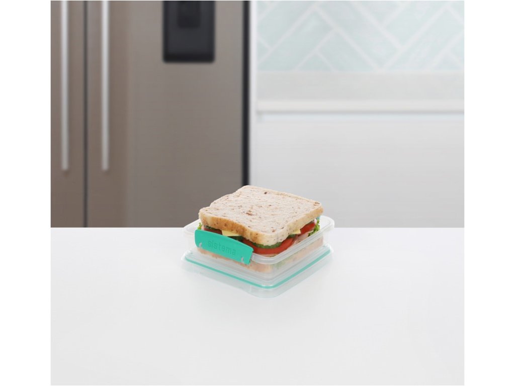 Pudełko jest łatwe do przenoszenia w plecaku, torbie lub torebce dzięki kompaktowym rozmiarom i niskiej wadze. Pojemność pudełka wynosi 450 ml, dzięki czemu zmieści się w nim duża kanapka, tortilla, wrap lub pita. Można w nim również przechowywać inne rodzaje żywności. Zalety: Łatwe zamykanie: klips Sistema® i elastyczna uszczelka. Przestronne i praktyczne. Modułowa konstrukcja.Parametry dodatkowe
