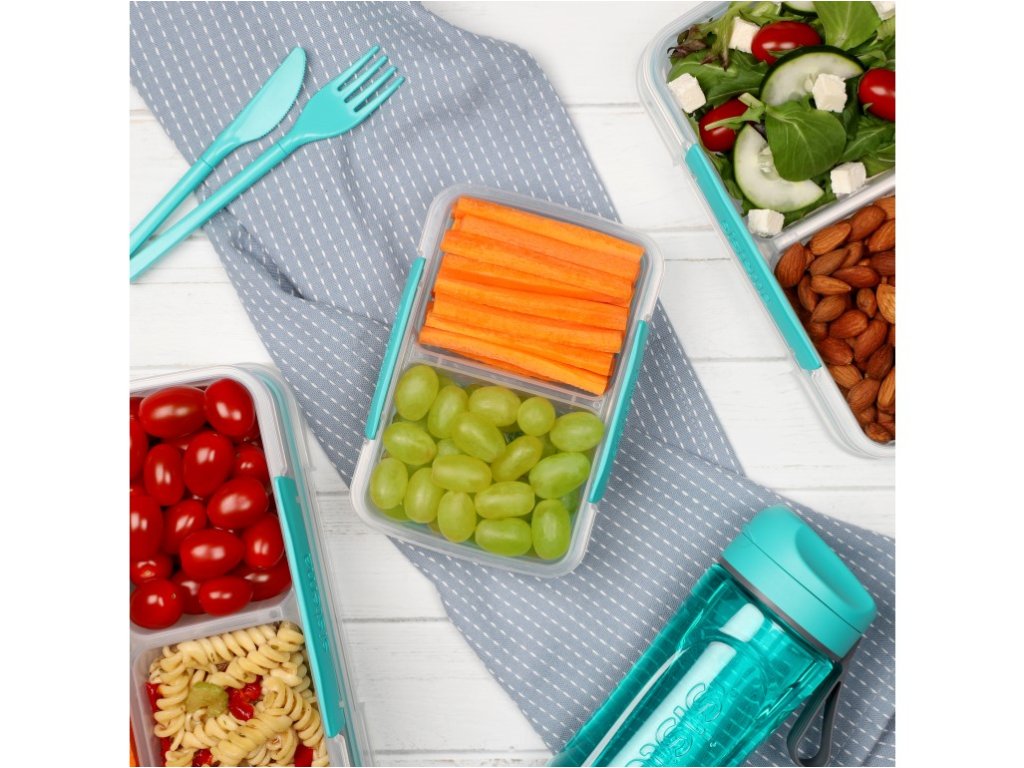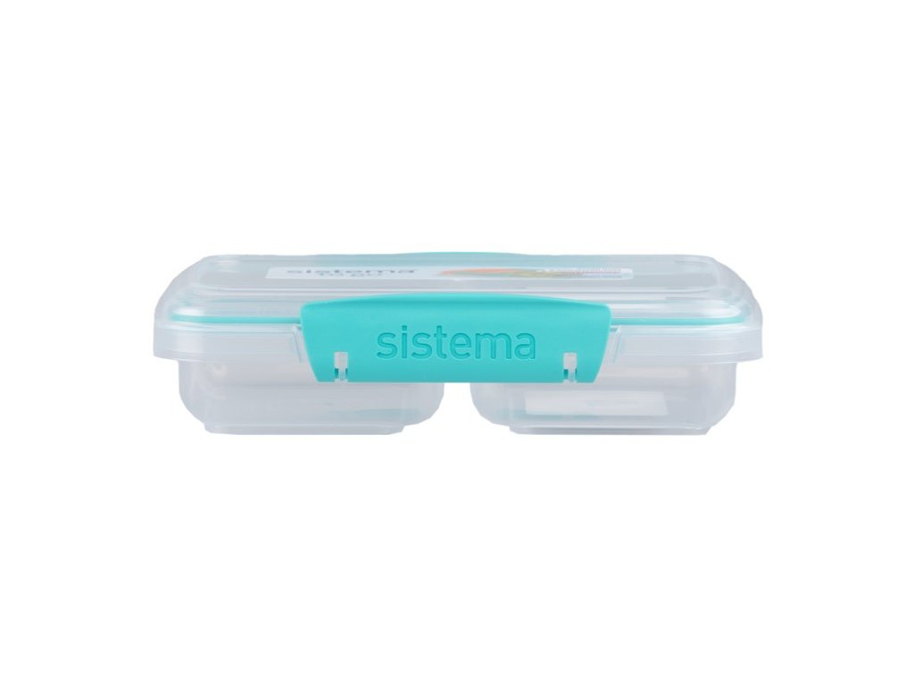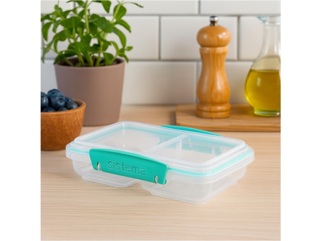 Pudełko jest podzielone na dwie komory, dzięki czemu możesz zabrać ze sobą dwa rodzaje żywności bez ryzyka ich pomieszania. To pudełko pomoże Ci ograniczyć zużycie plastikowych torebek i folii spożywczej, zapewniając jednocześnie świeżość i smak żywności. Zalety: • Dwie komory • Łatwe zamykanie: klips Sistema® i elastyczna uszczelka • Modułowa konstrukcjaParametry dodatkowe