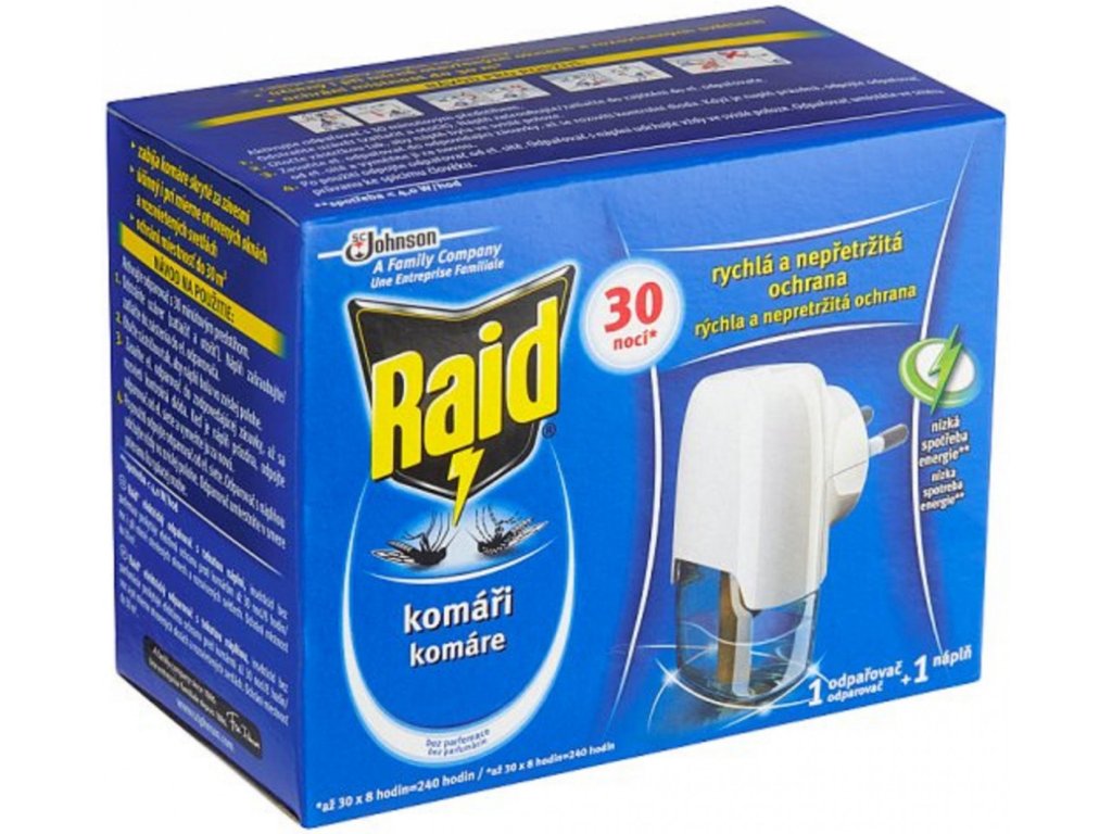 Elektryczny inhalator Raid z płynnym wypełnieniem, bezzapachowy insektycyd do użytku domowego. Z nową, smukłą konstrukcją inhalatora i kontrolką działania. Zapewnia skuteczną ochronę, działa szybko przeciwko komarom i innym małym owadom latającym, nawet przy lekko uchylonych oknach i włączonym oświetleniu, nawet do 30 nocy, przy użytkowaniu 8 godzin na dobę. Chroni pomieszczenie o kubaturze do 30 m³. Można stosować we wcześniejszych inhalatorach Raid. Dodatkowe ostrzeżenia i instrukcje użytkowania znajdują się wewnątrz opakowania.