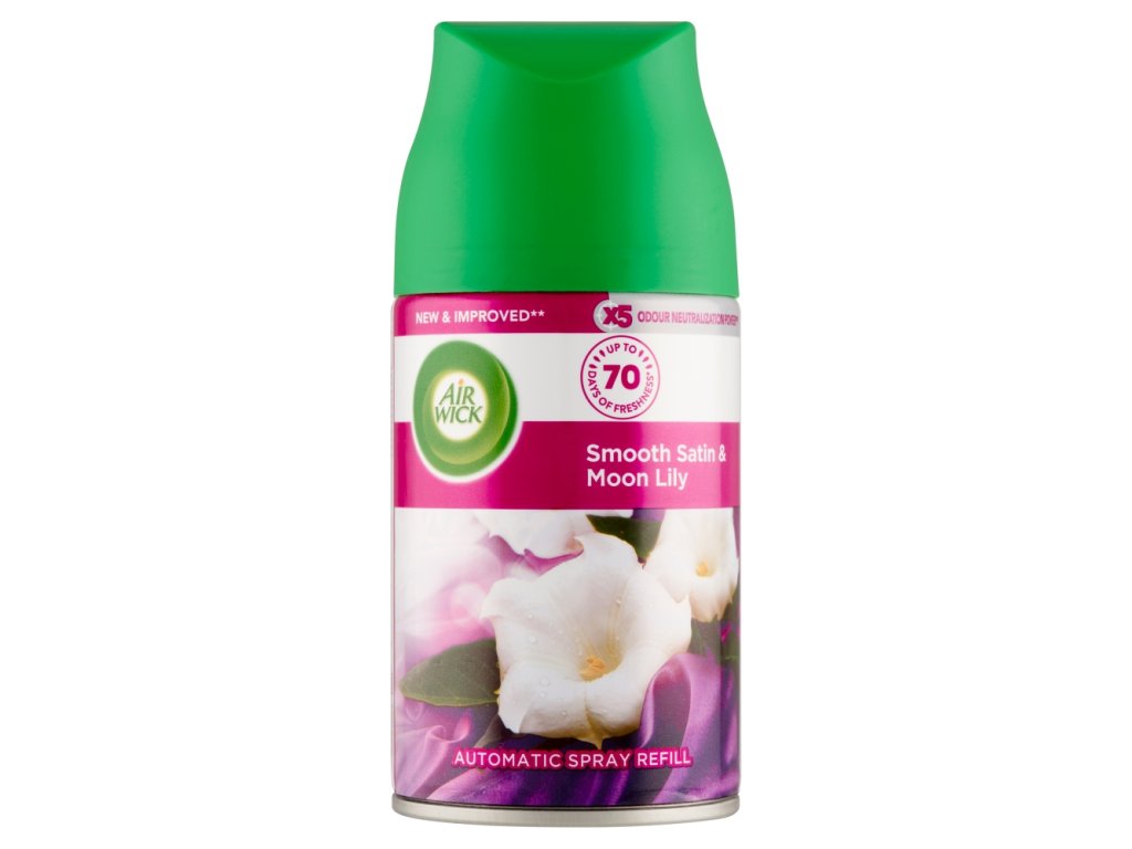 Poczuj uwodzicielskie, kwiatowe nuty lilii księżycowej i zanurz się w luksusowym świecie satynowych prześcieradeł i delikatnego zapachu. Zawiera naturalne olejki eteryczne pozyskiwane z roślin i kwiatów. Wzbogać zapach swojego domu dzięki automatycznemu sprayowi Air Wick Freshmatic.