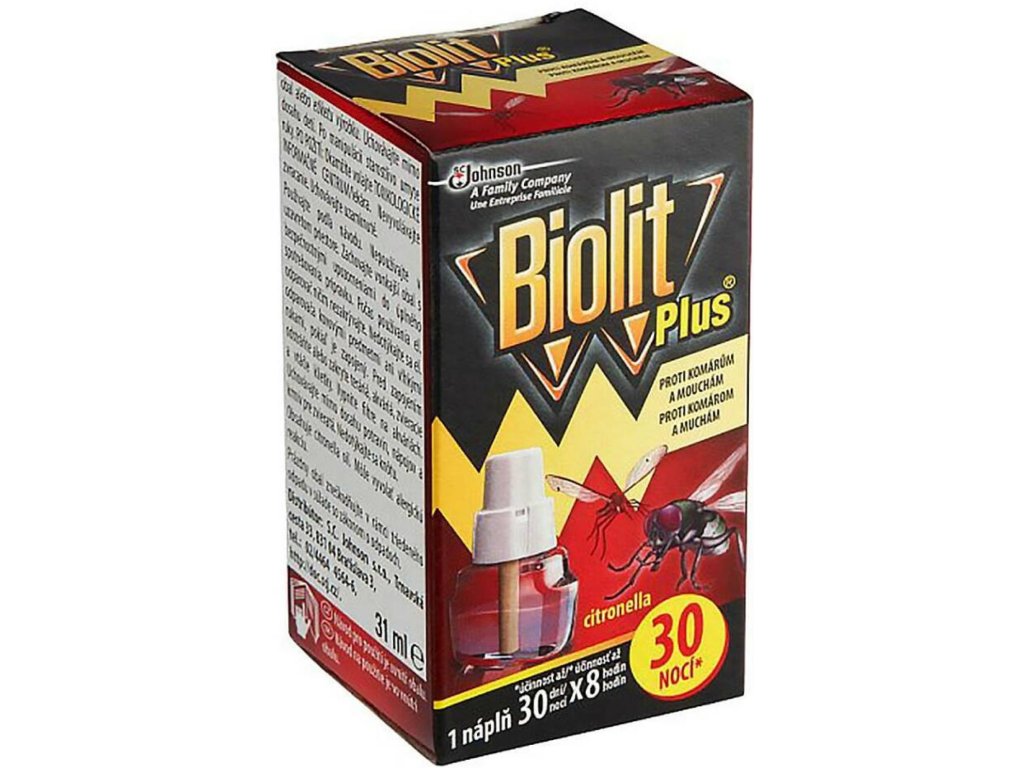 Elektryczny inhalator Biolit Plus chroni przed komarami i muchami do 30 dni. Zabija komary ukryte za zasłonami, pod stołami i w trudno dostępnych kątach. Chroni pomieszczenie o kubaturze do 34 m³ przed komarami. Zapewnia szybkie działanie i ciągłą ochronę przed komarami i muchami, o świeżym zapachu cytronelli. Chroni pomieszczenie o kubaturze do 20 m³ przed muchami.