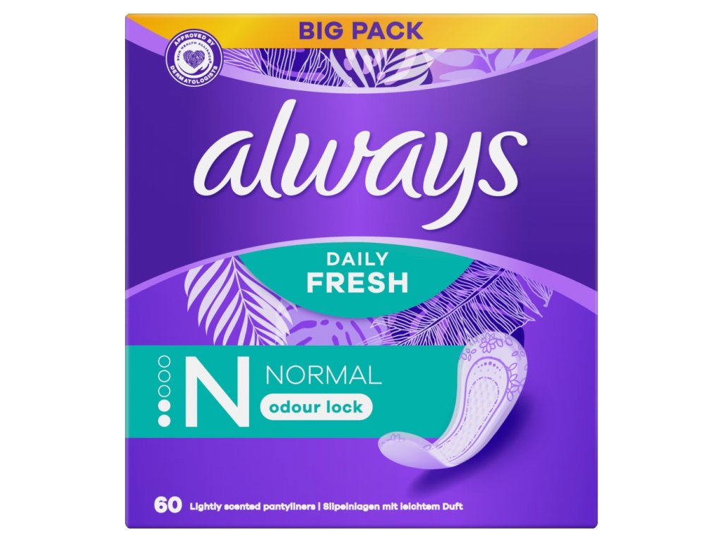 Zachowaj świeżość przez cały dzień dzięki wkładkom higienicznym Always Fresh & Protect Normal. Wygodna konstrukcja zapewnia doskonałe połączenie komfortu i ochrony, dzięki czemu możesz na nich polegać każdego dnia, nie odczuwając ich obecności. Idealne w przypadku upławów lub dla zwiększonej ochrony podczas nieregularnych miesiączek.