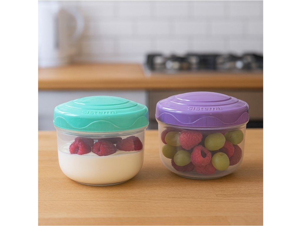 Praktyczne kubki Sistema o pojemności 210 ml, sprzedawane w zestawie po dwie sztuki, idealnie nadają się do bezpiecznego przenoszenia mniejszych porcji owoców, sałatki, sosu lub innych smakołyków. Kubki stanowią doskonały dodatek do klasycznych pudełek na przekąski. Zalety: • Łatwe otwieranie zakręcanej pokrywki, idealne uszczelnienie • Możliwość układania w stosyParametry dodatkowe